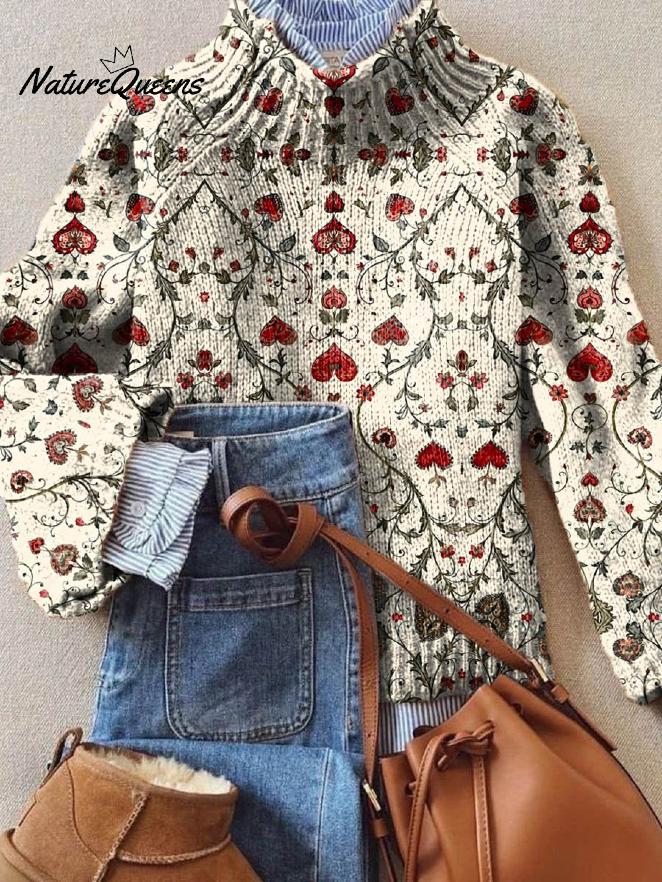 Valentine's Day Love Floral Art Print Knit Turtleneck Pullover Sweater