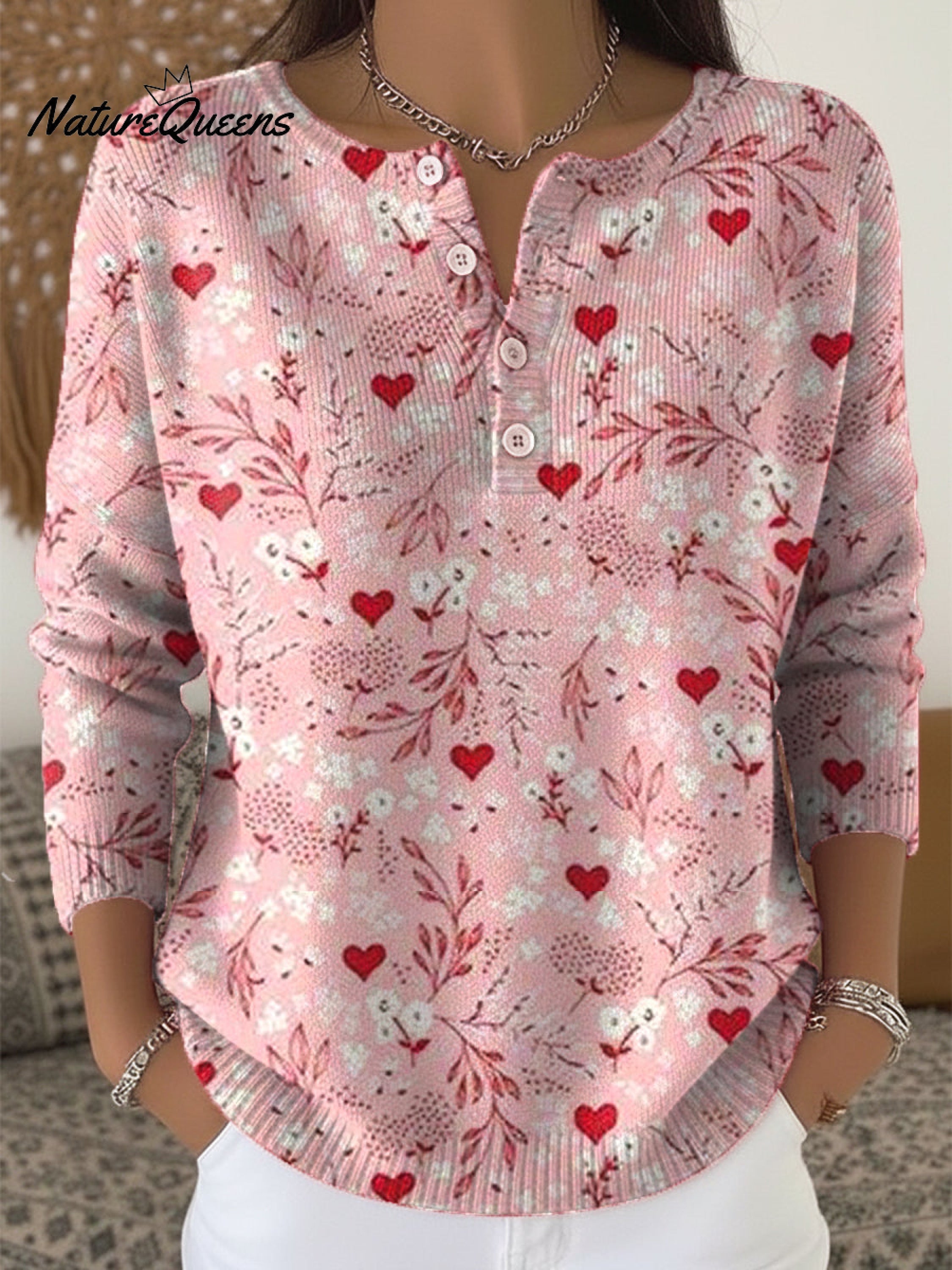Women's Retro Plaid Heart Art Print Valentine's Day Casual Sweater