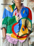 Women's Colorful Abstract Sea Fish Art Print Casual Cotton And Linen Ruffle Shirt