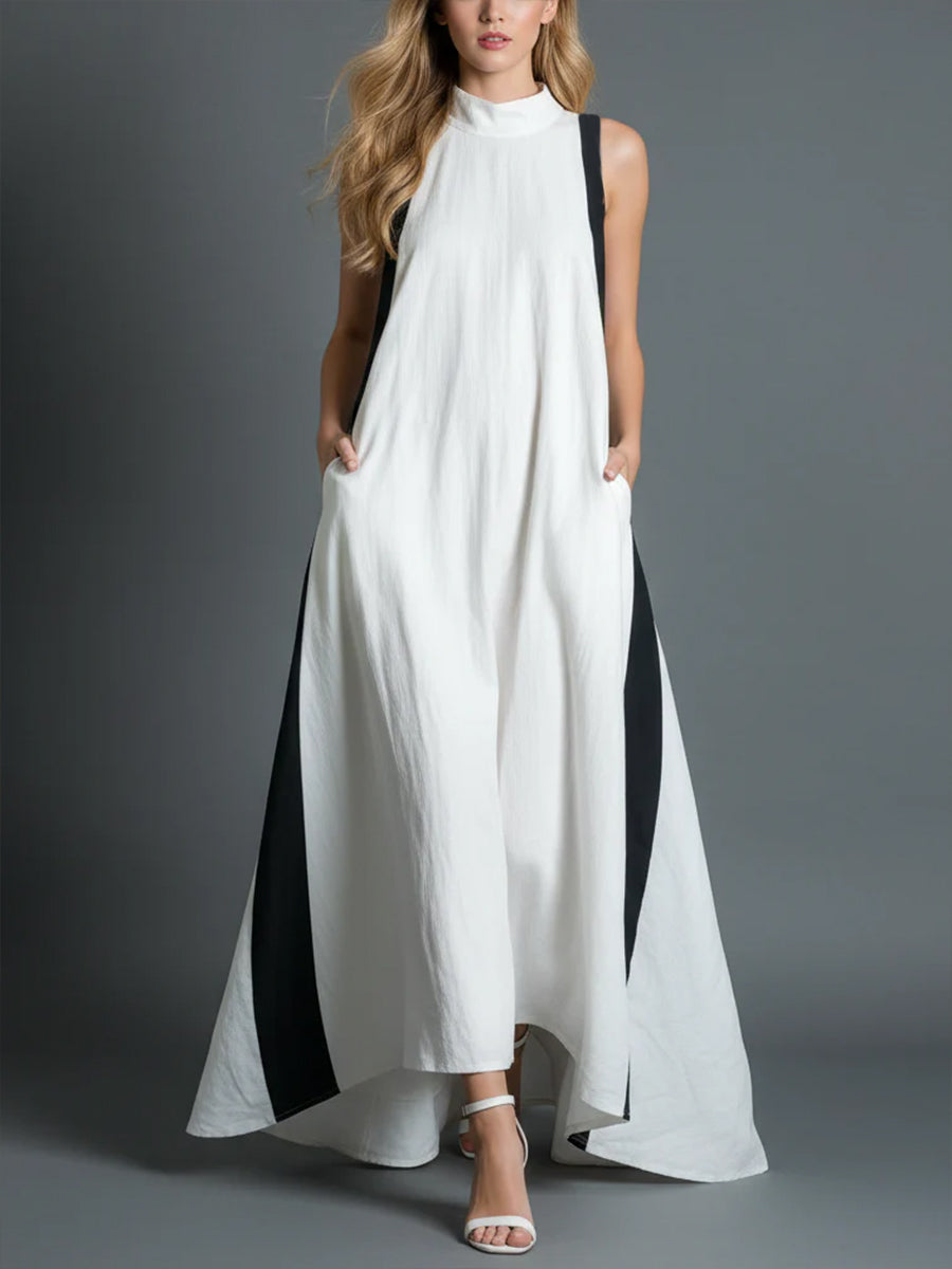 Black And White Color-blocked Linen And Cotton Sleeveless Dress