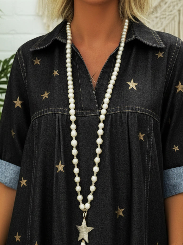 Casual Polo Collar Gold Star Print Denim DressCasual Polo Collar Gold Star Print Denim Dress