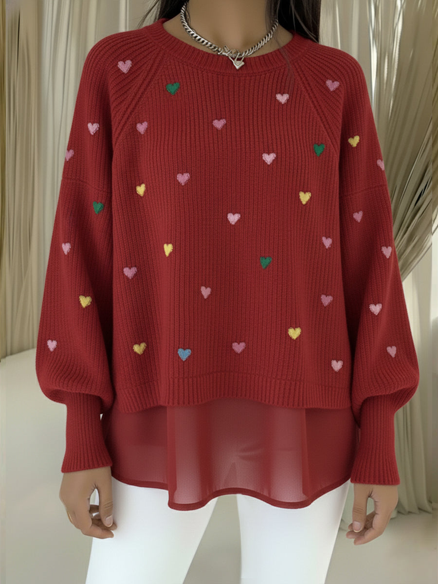 Comfortable Heart Embroidered Chiffon Patchwork Pullover Sweater