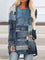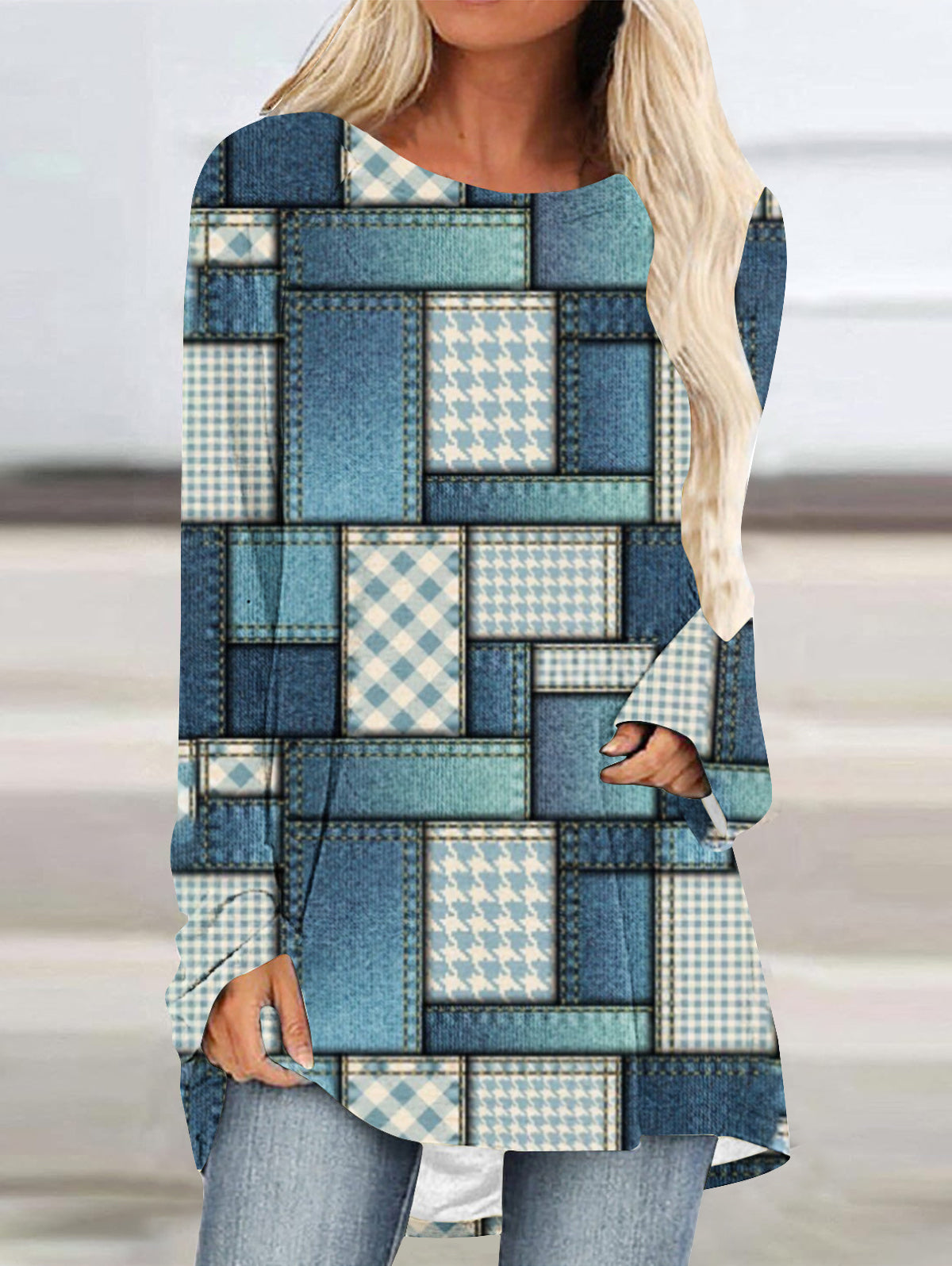 Crew Neck Long Sleeve Denim Pattern Mid-length Blouse