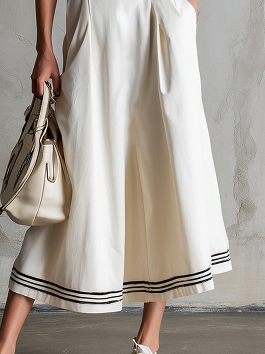 Elegant Sporty Striped Trim White Cotton Sleeveless Midi Dress