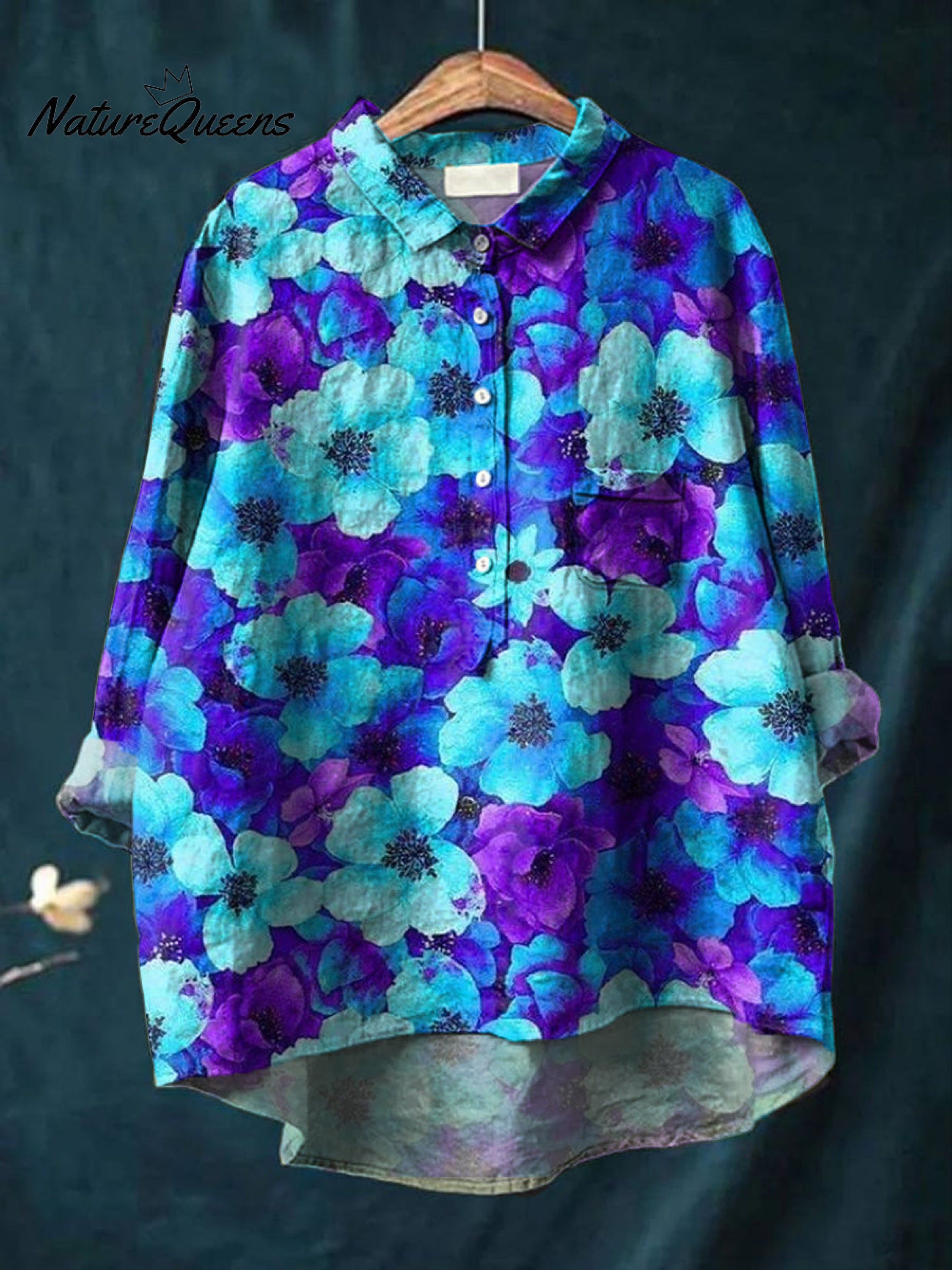 Femmes Vintage Floral Art Print Casual coton et lin col rond bouton poche Midi manches chemise Top