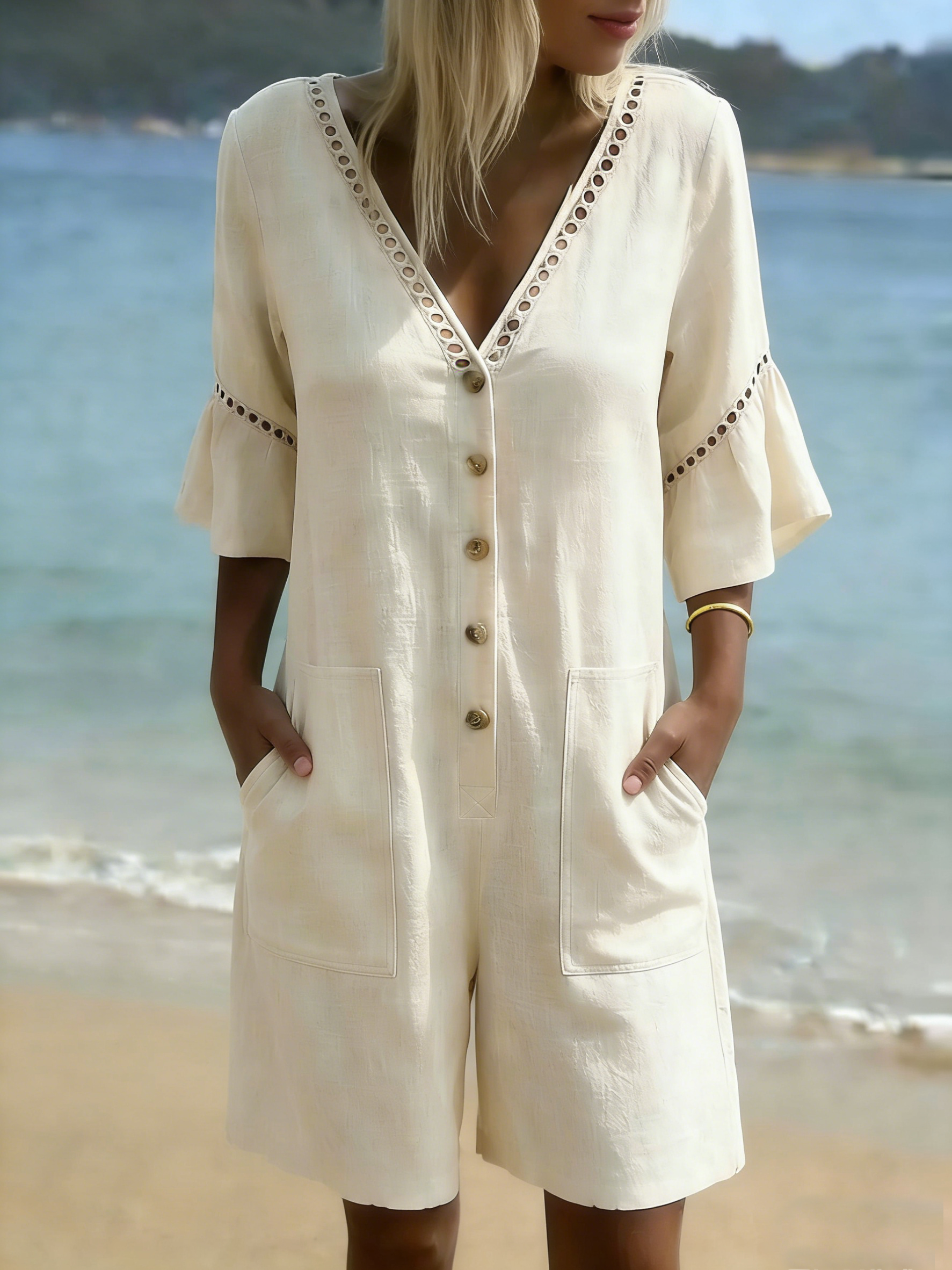 Retro Loose-fit Cutout Lace Cotton-linen Jumpsuit