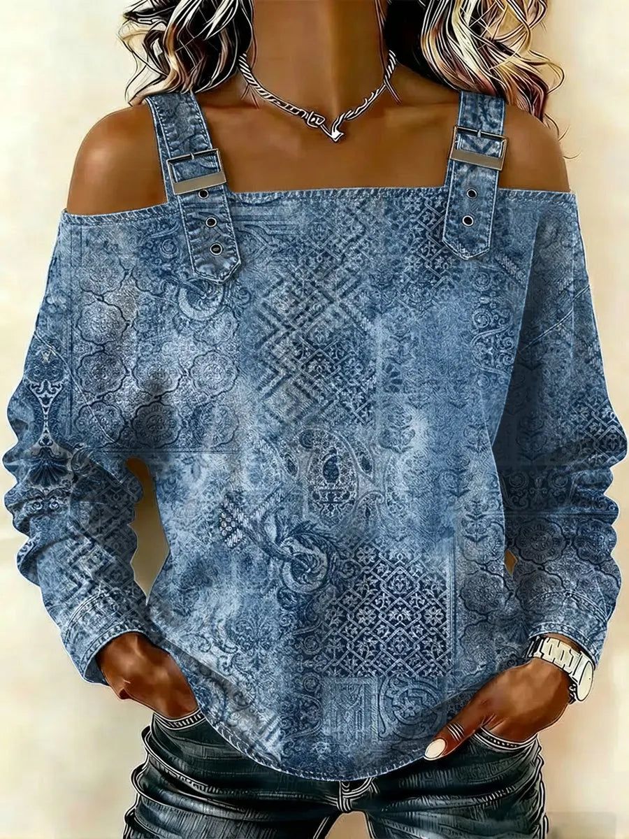 Women‘s Vintage Pattern Art Print Casual Cotton Denim Shirt
