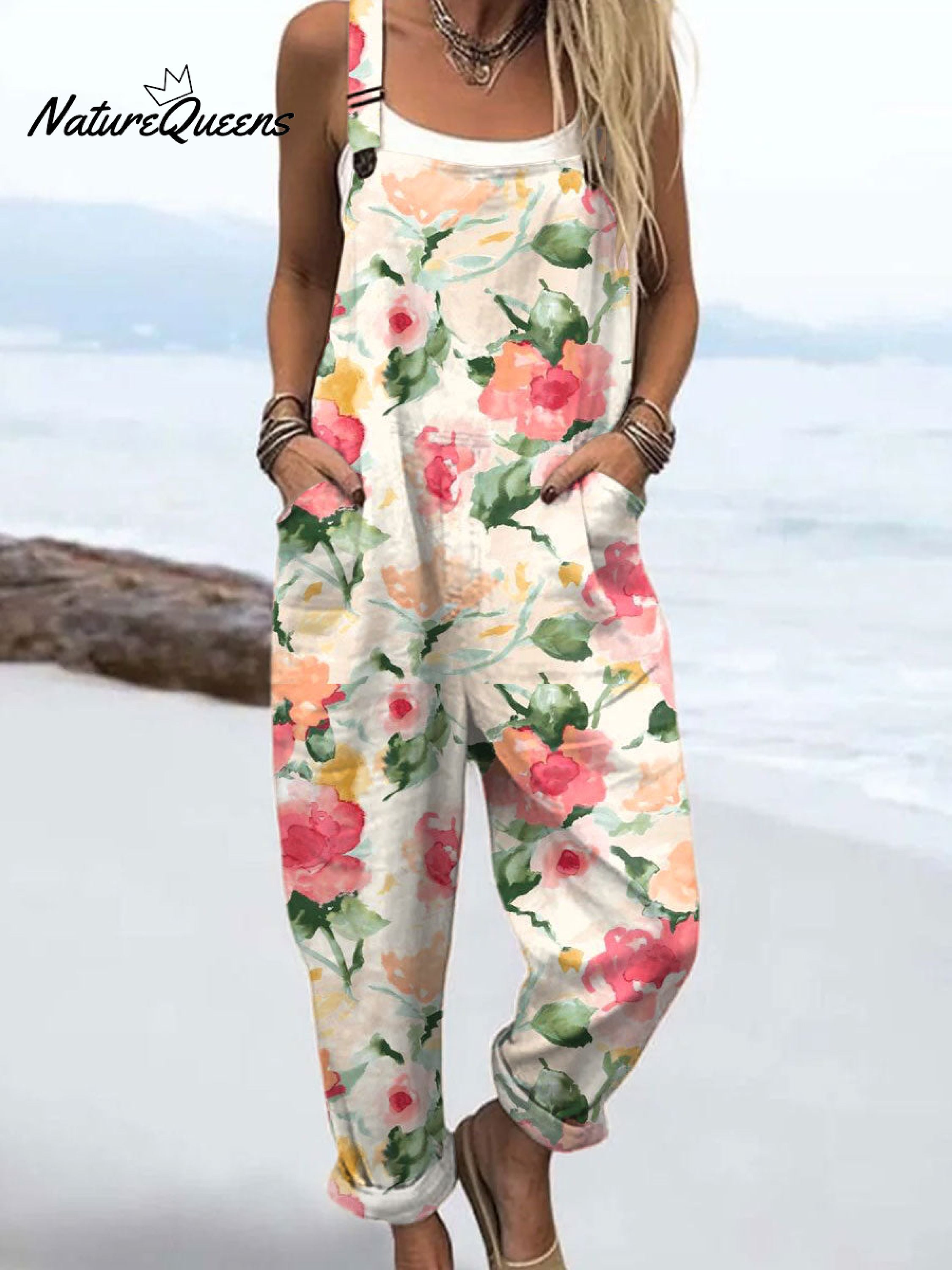 Women's Floral ArtPrint Casual 100% Cotton Wide Leg Jumpsuit