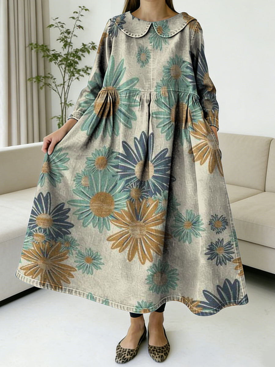 Women's Fun Daisy Decorative Patterns Casual Peter Pan Collar Denim Jeans Dress