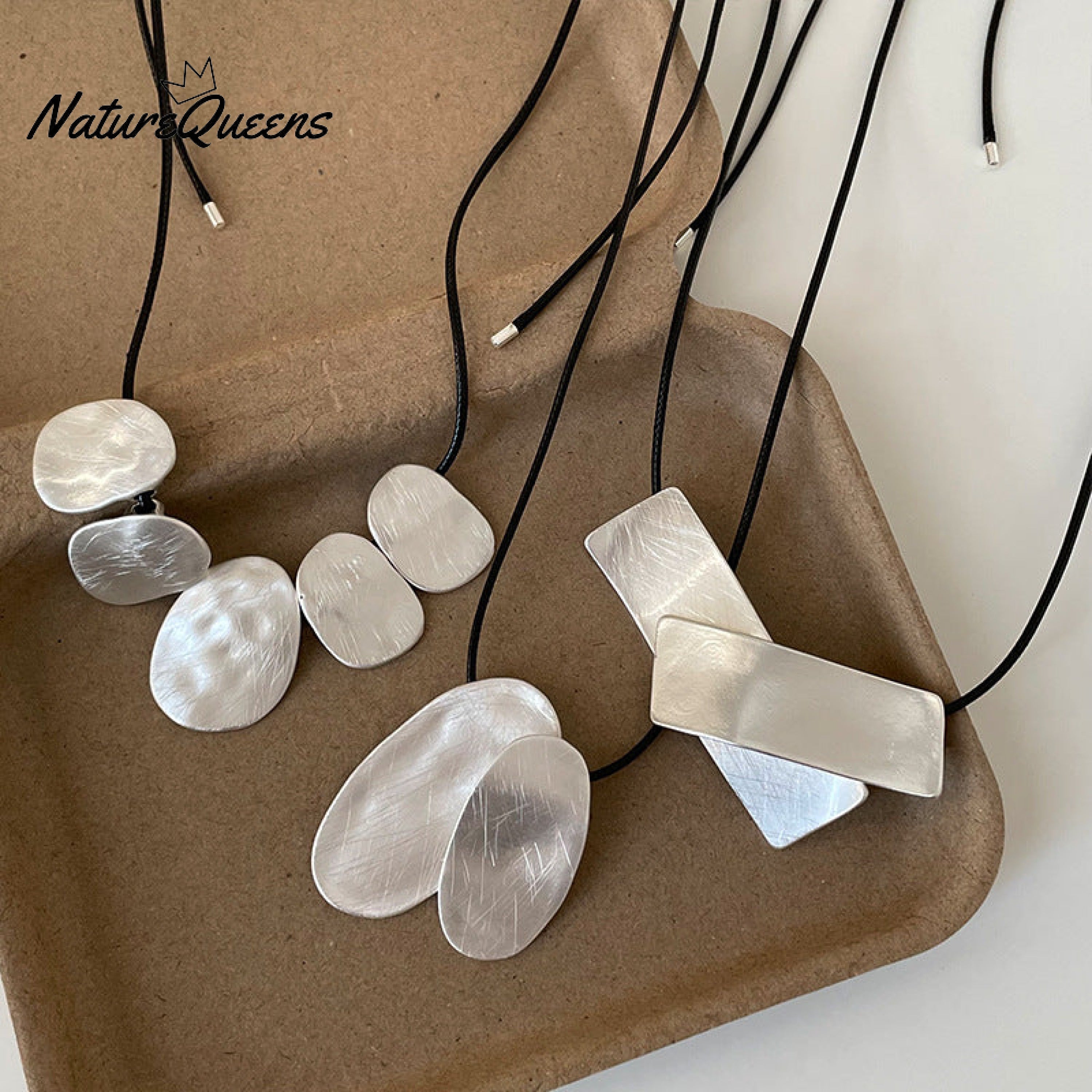 Women's Irregular Brushed Metal Pendant Pull-out Black Rope Necklace