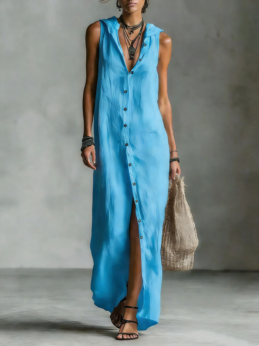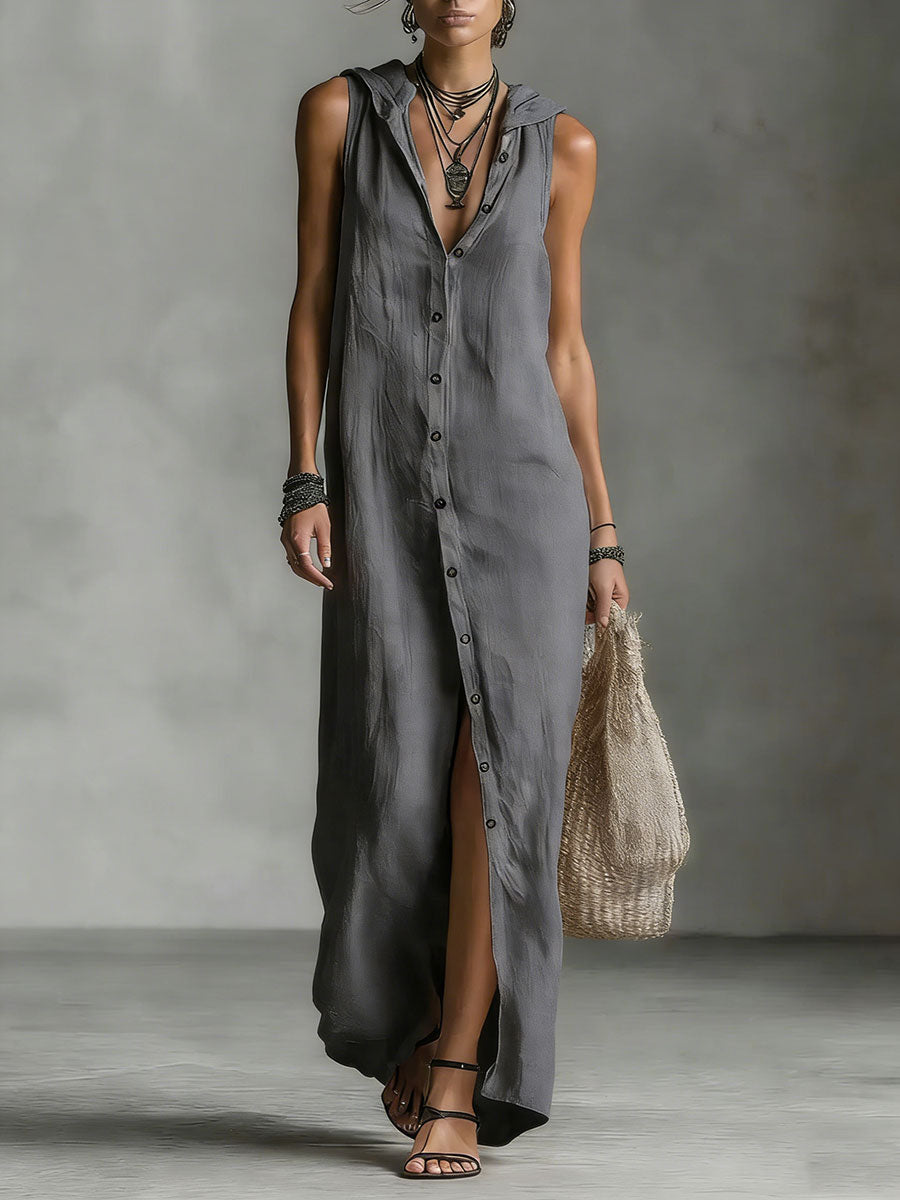 Women's Retro Hooded Solid Color Long-sleeved Cotton Linen Dress