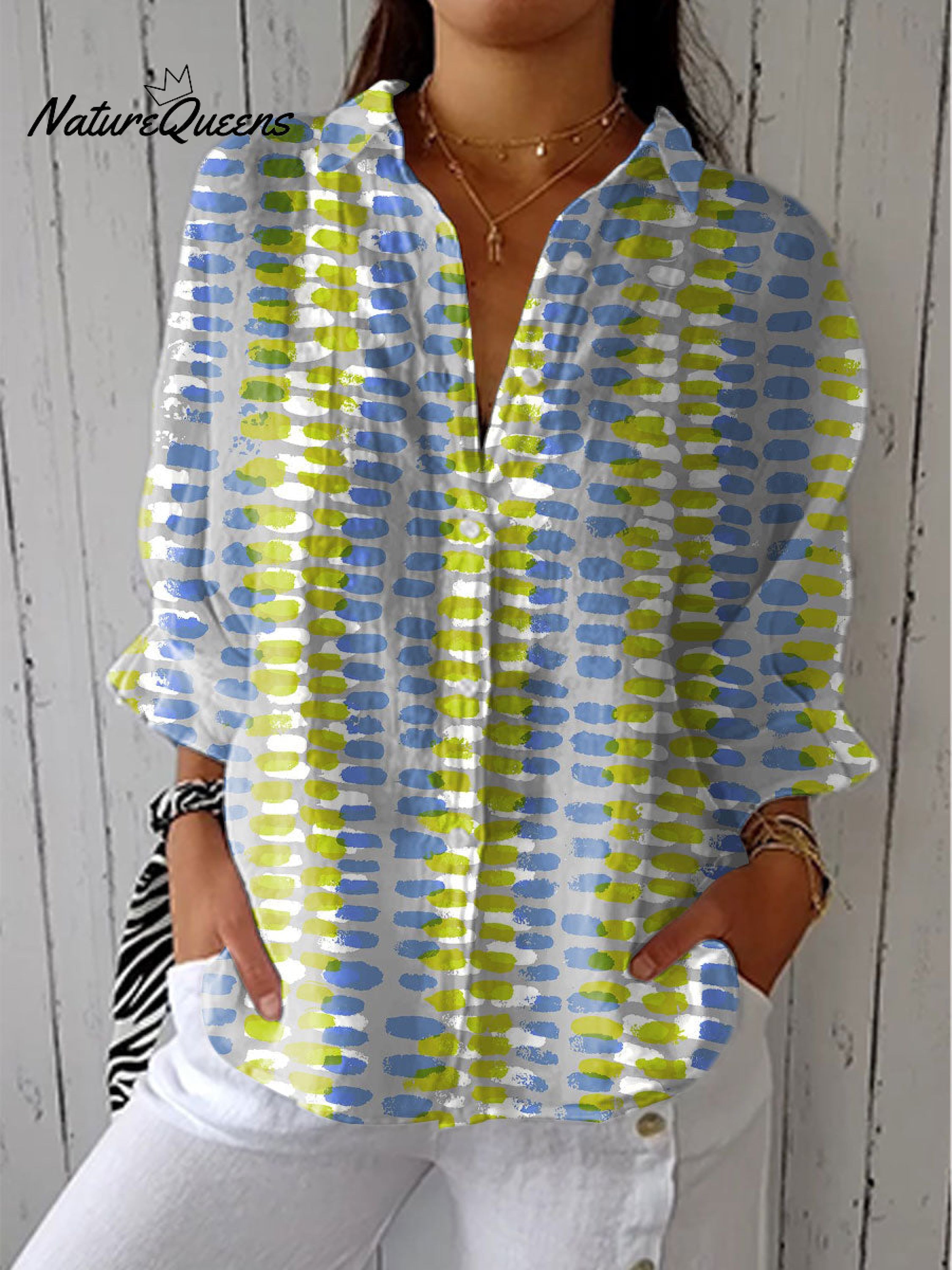 Women's Simple Graffiti Art Print Casual Linen V-neck Shirt