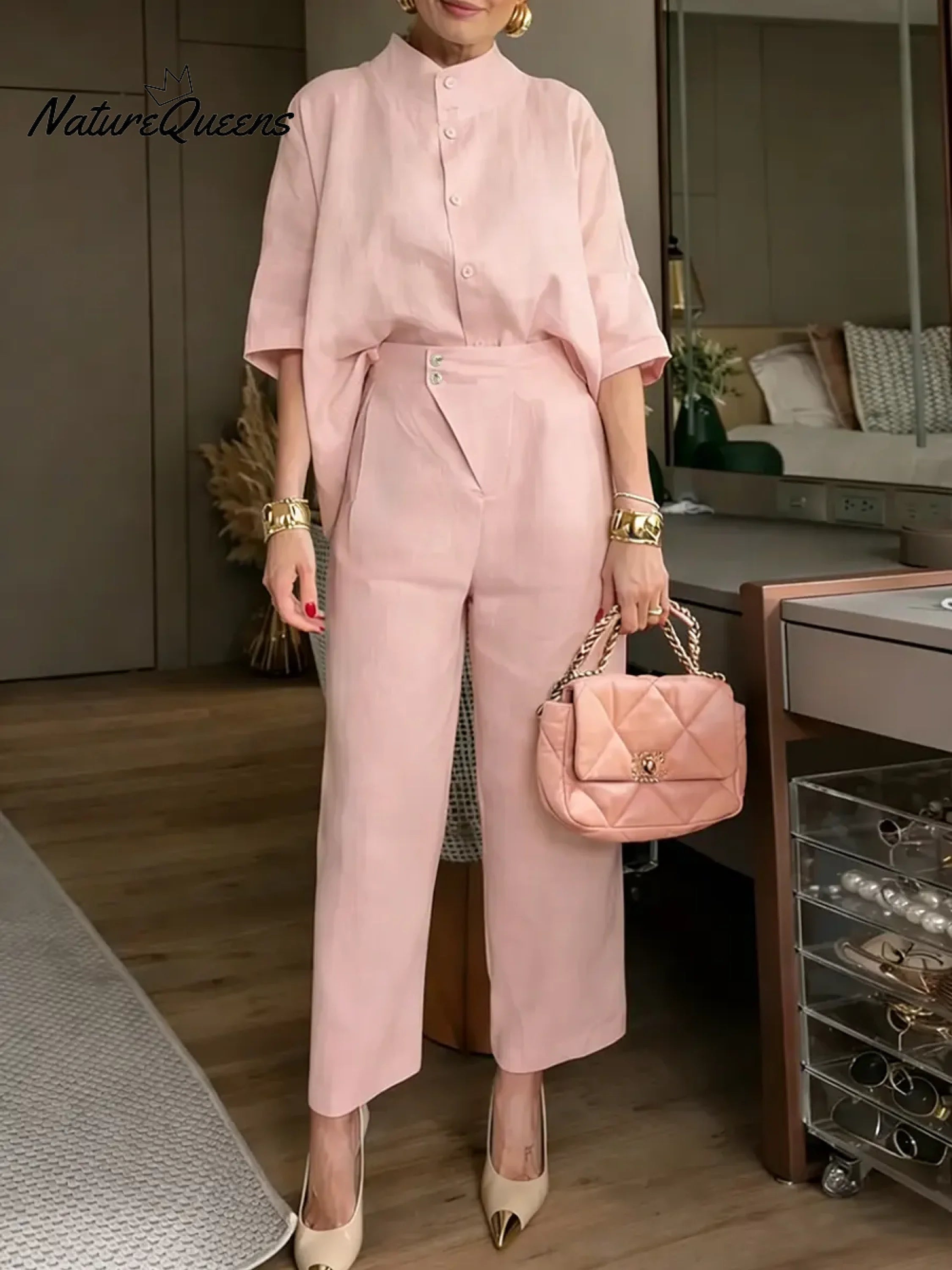 Women's Solid Color Stand-collar Three-quarter Sleeve Casual Loose Cotton And Linen Cardigan And High-waisted Wide-leg Pants Set