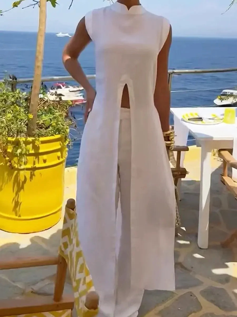 Women's Stylish Casual Elegant Resort Cotton Linen Front Slit Midi Top And Elastic Waist Loose Pants SetWomen's Stylish Casual Elegant Resort Cotton Linen Front Slit Midi Top And Elastic Waist Loose Pants Set
