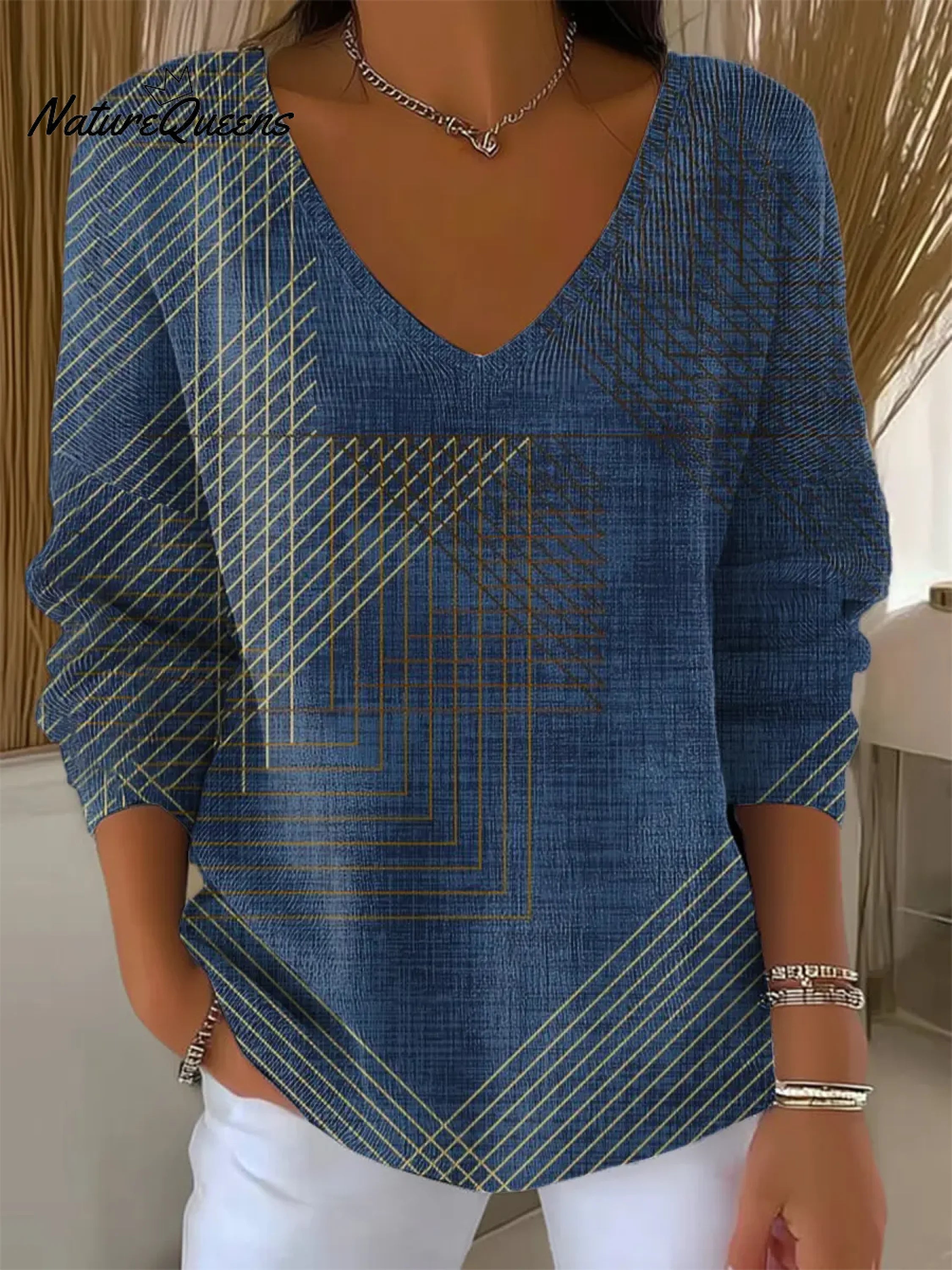 Women's Vintage Abstract GeometryArt Print V-neckLooseSweater