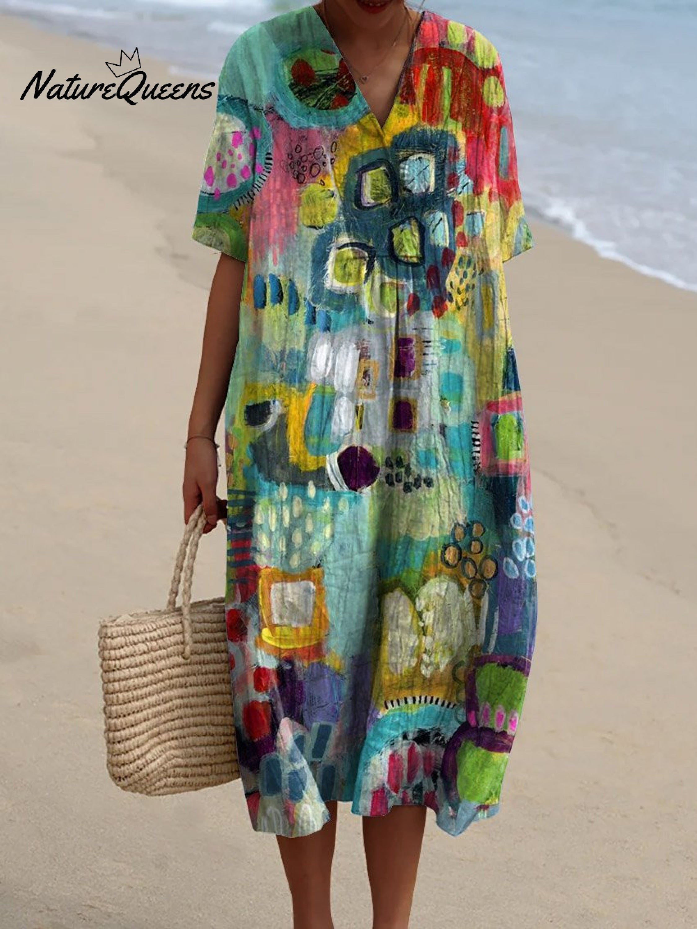 Women's Vintage Abstract Painting Art Print Flowy Dress