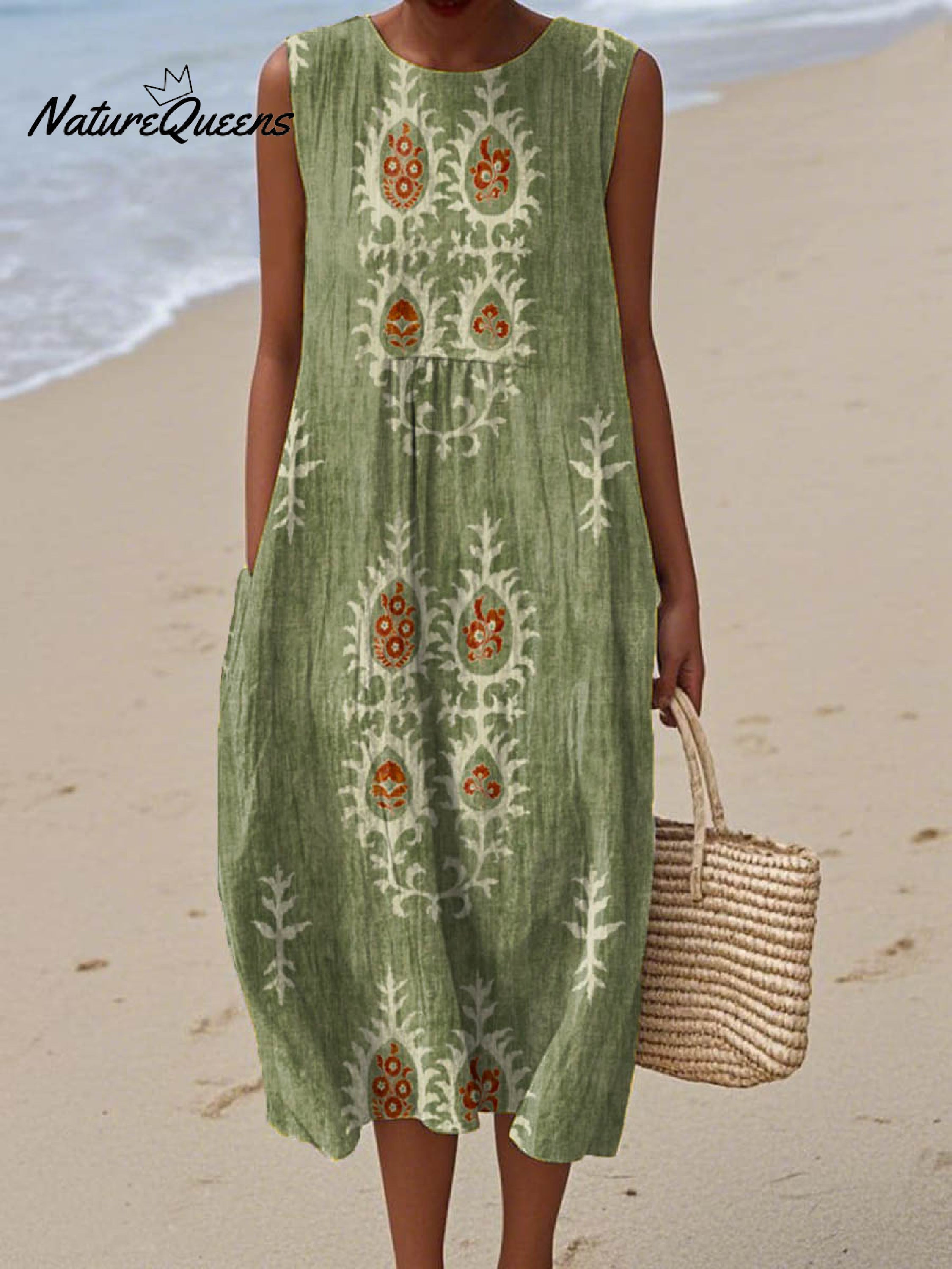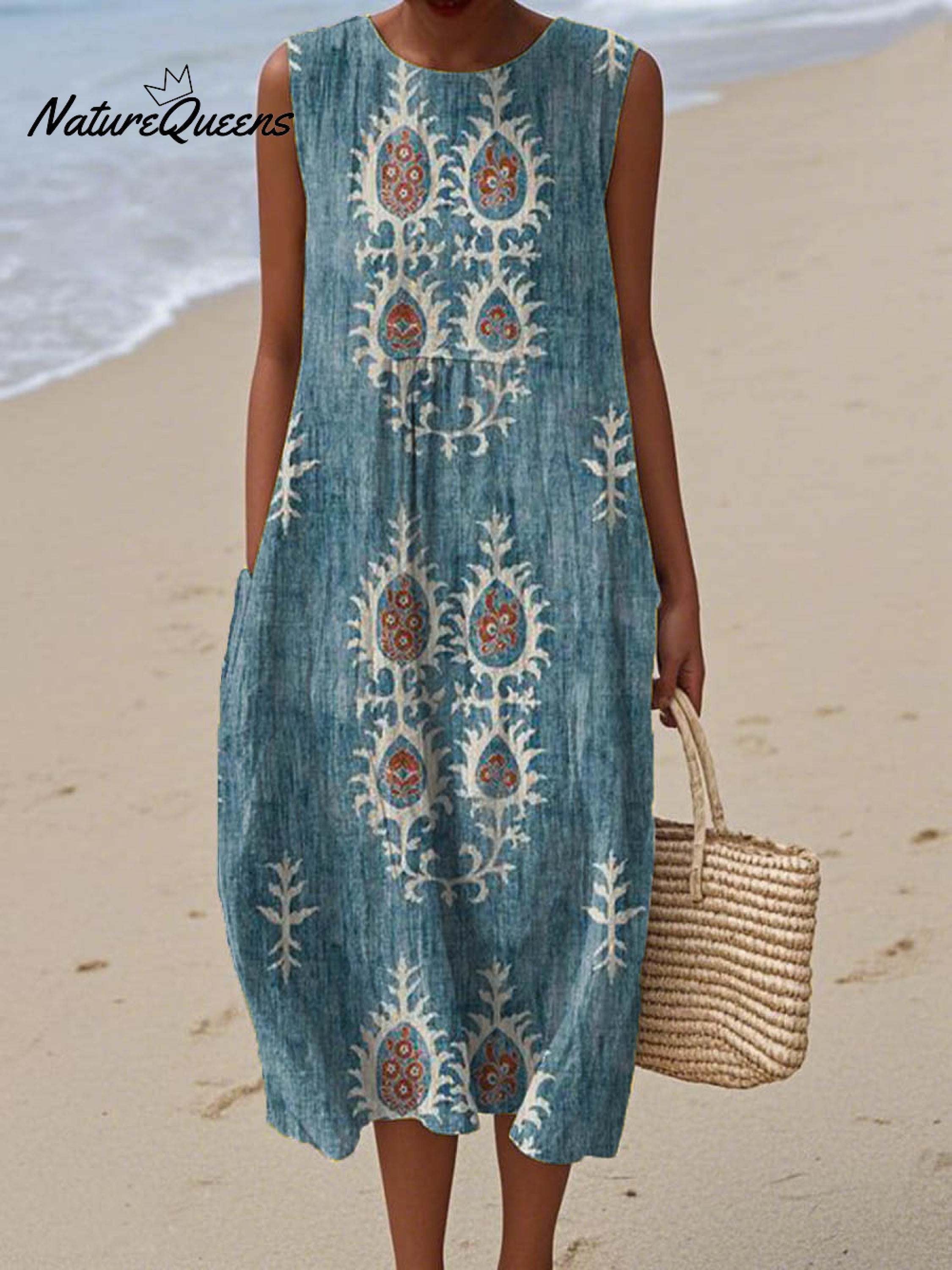 Women's Vintage Ethnic Pattern Art Print Sleeveless Cotton Pocket Wrap Dress