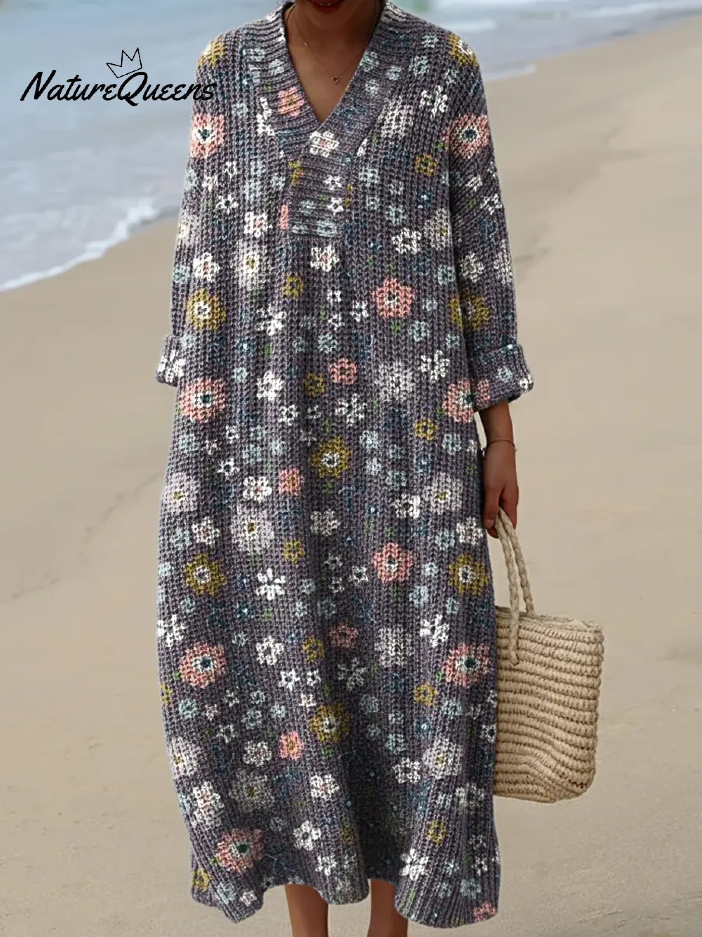 Women's Vintage Flower Art Print Casual Cotton Knitted Dress