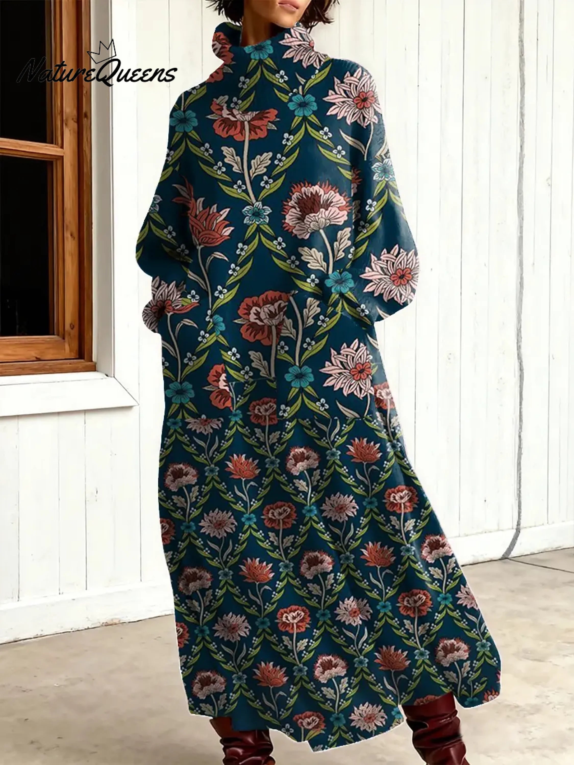 Women's Vintage Flower Art Print Casual Cotton Knitted Dress
