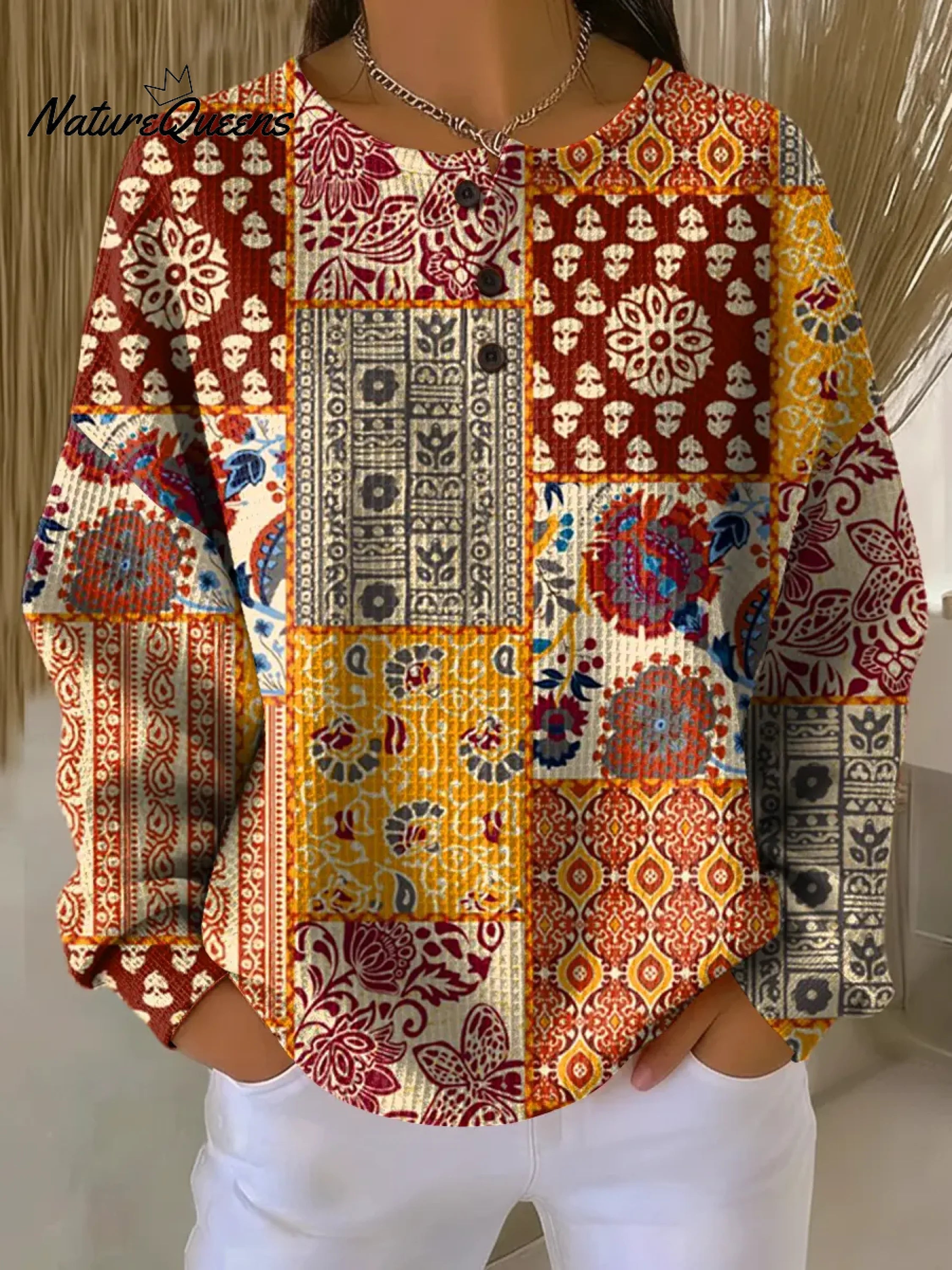 Women's Vintage Hippie Flowers Pattern Art Print Casual Waffle Sweatshirt