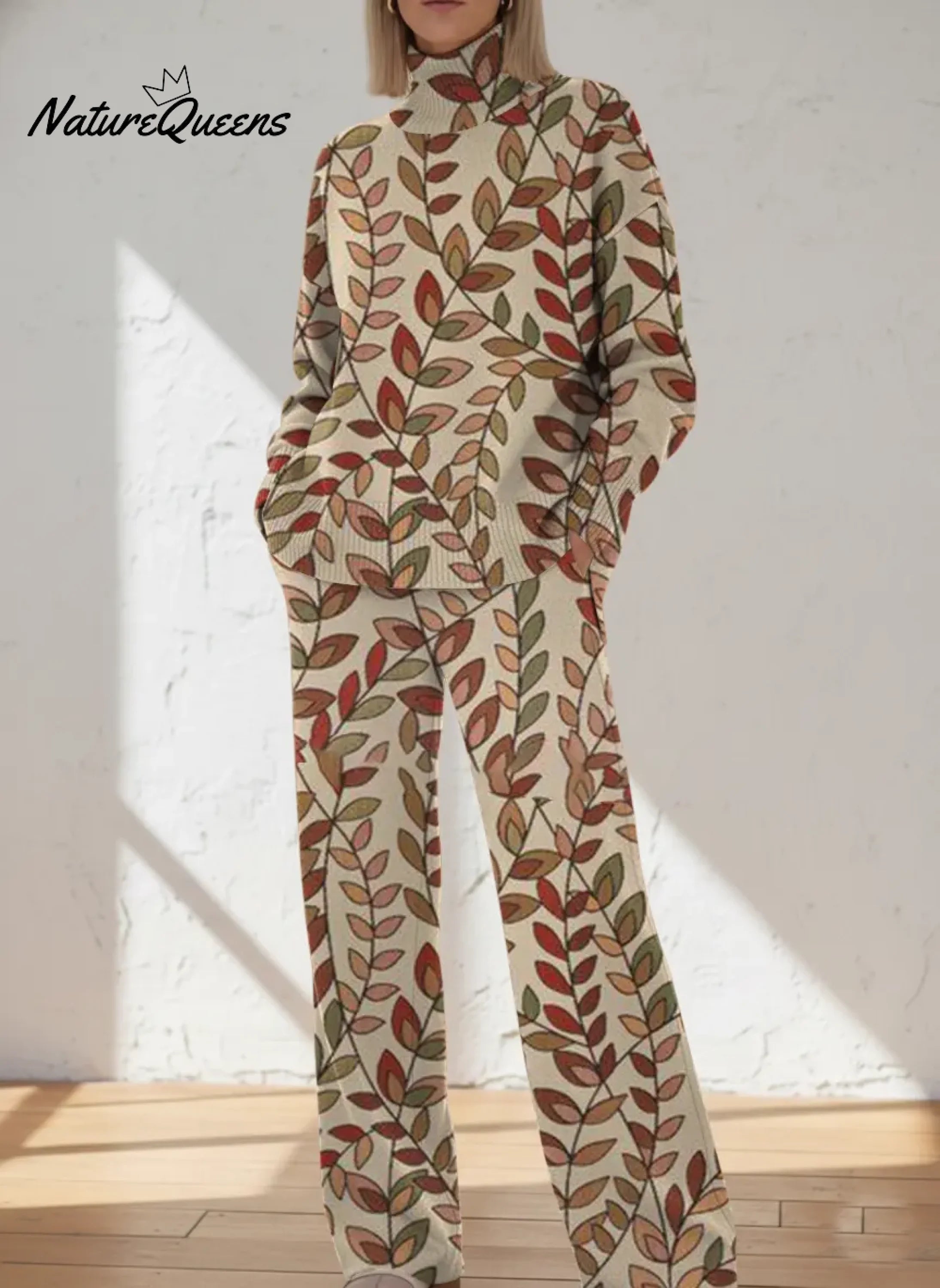 Women's Vintage Leaves Art Print Casual Knitted Cotton Top Pants Suit