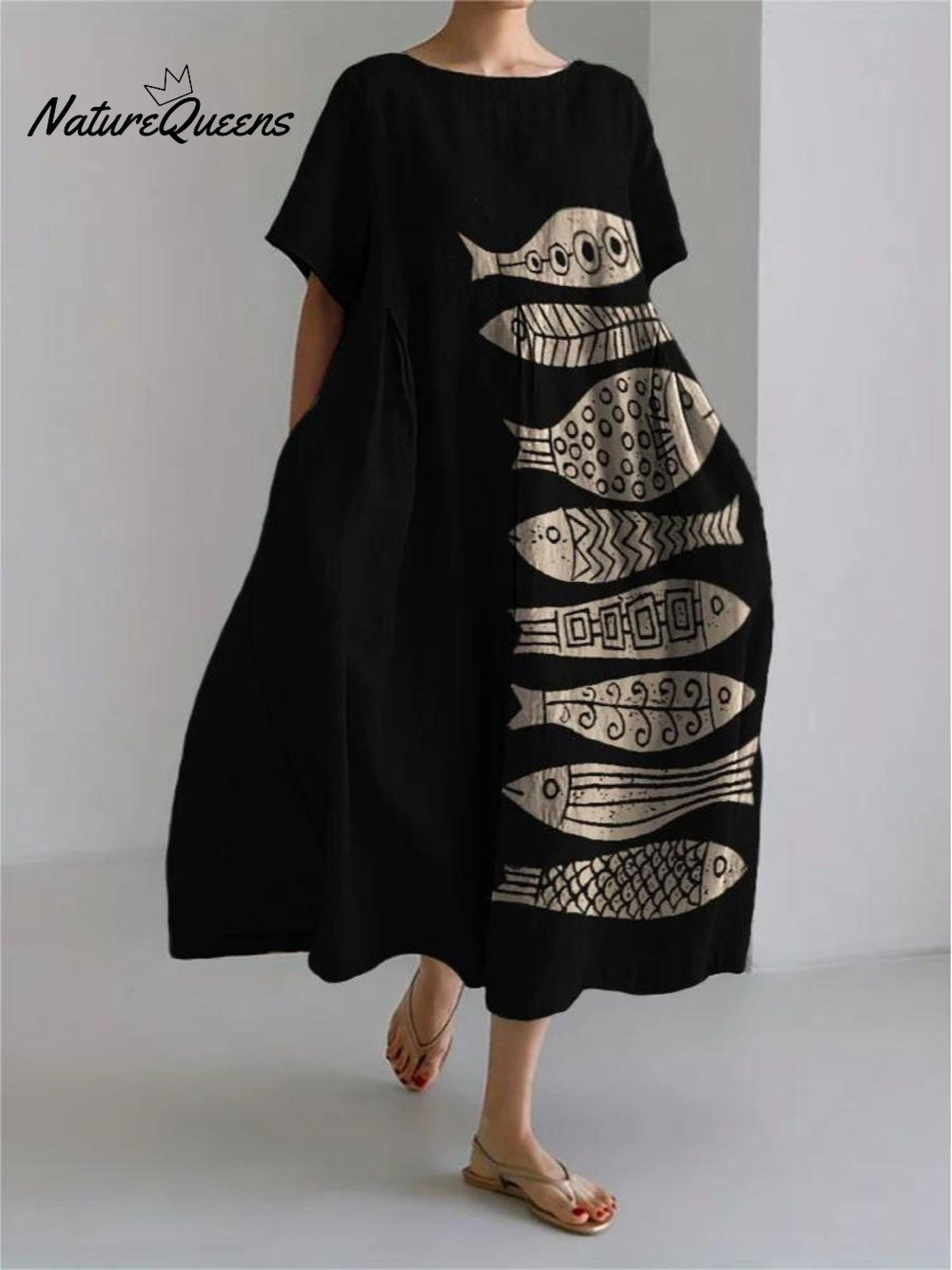 Women's Vintage Lovely Fish Art Print Large Size Loose Casual Dress