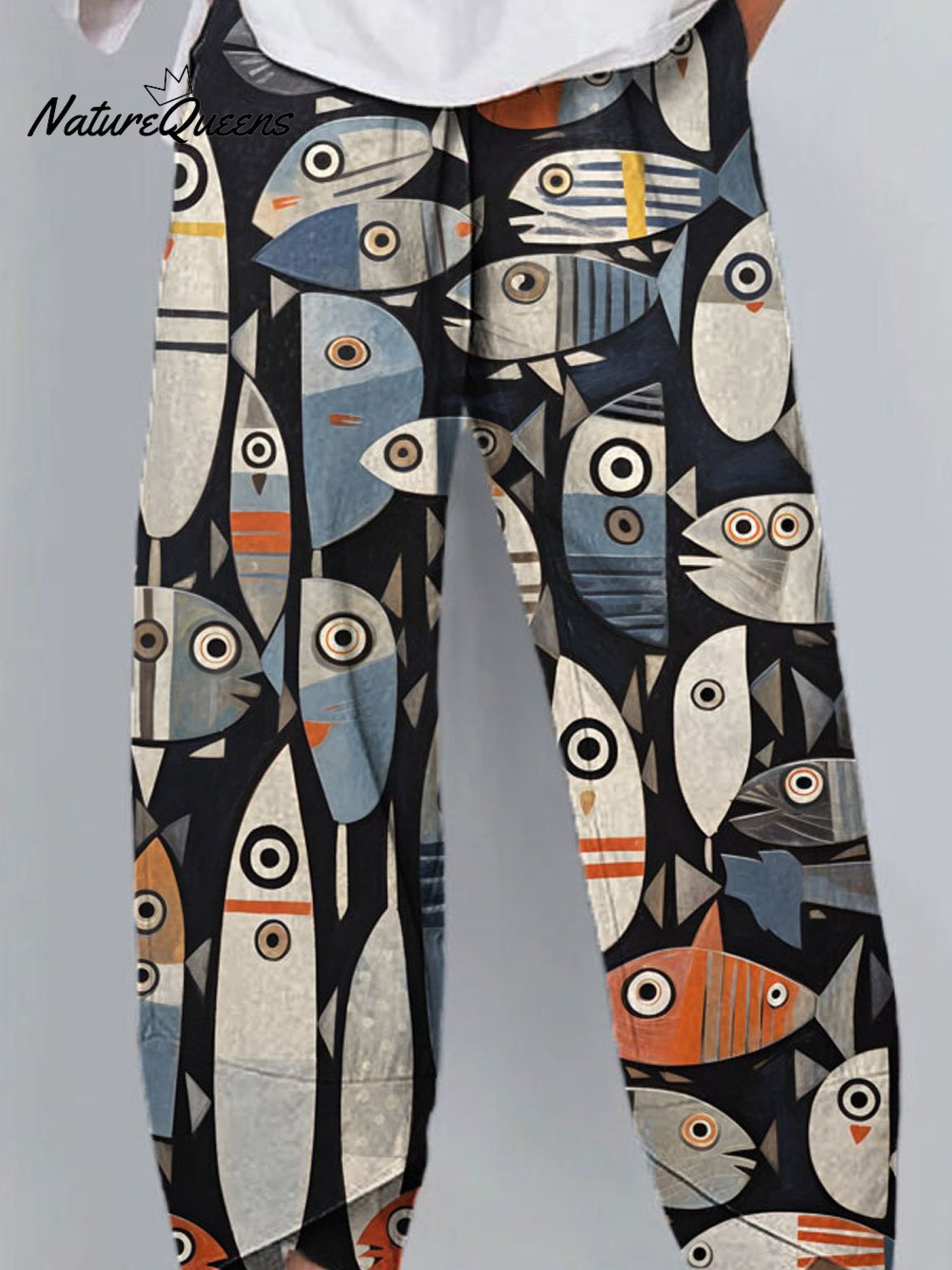 Women's Vintage Lovely Fish Art Printed Cotton And Linen Casual Pants