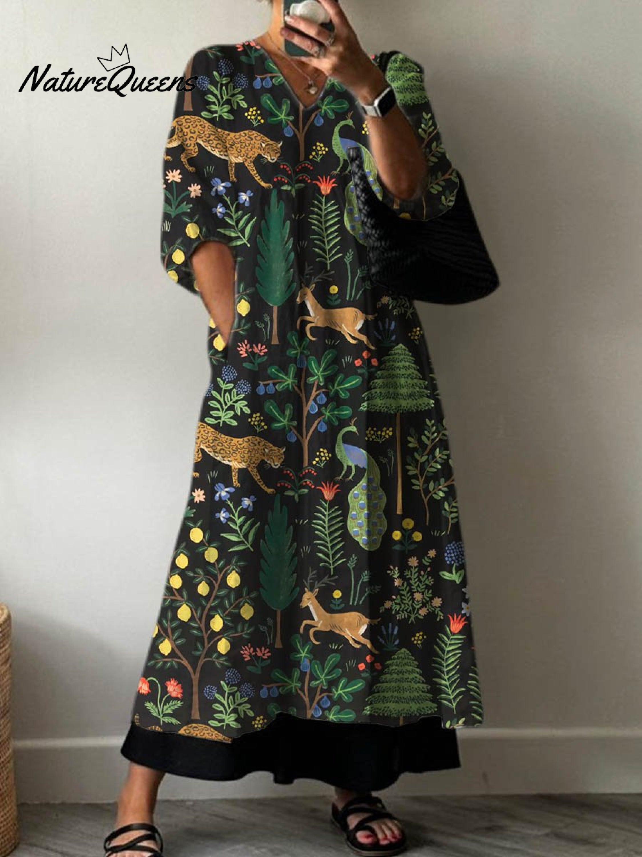 Women's Vintage Lovely Floral Animals Art Print Pocket V-neck Cotton Dress