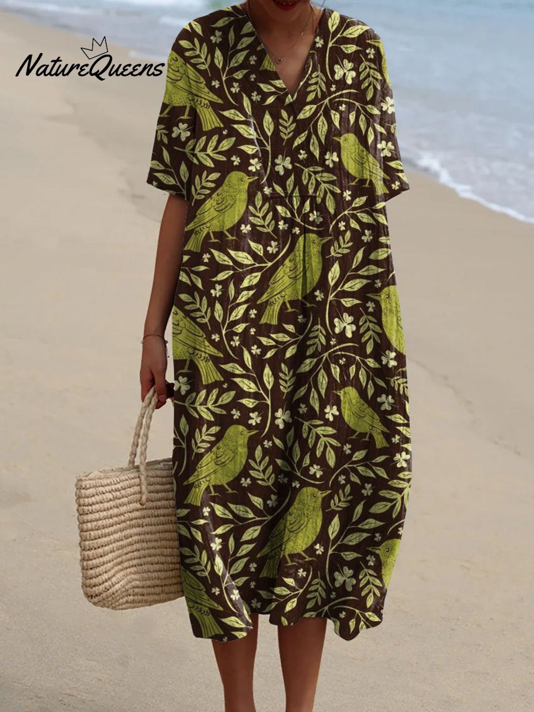 Women's Vintage Lovely Floral Birds Art Print Flowy Dress