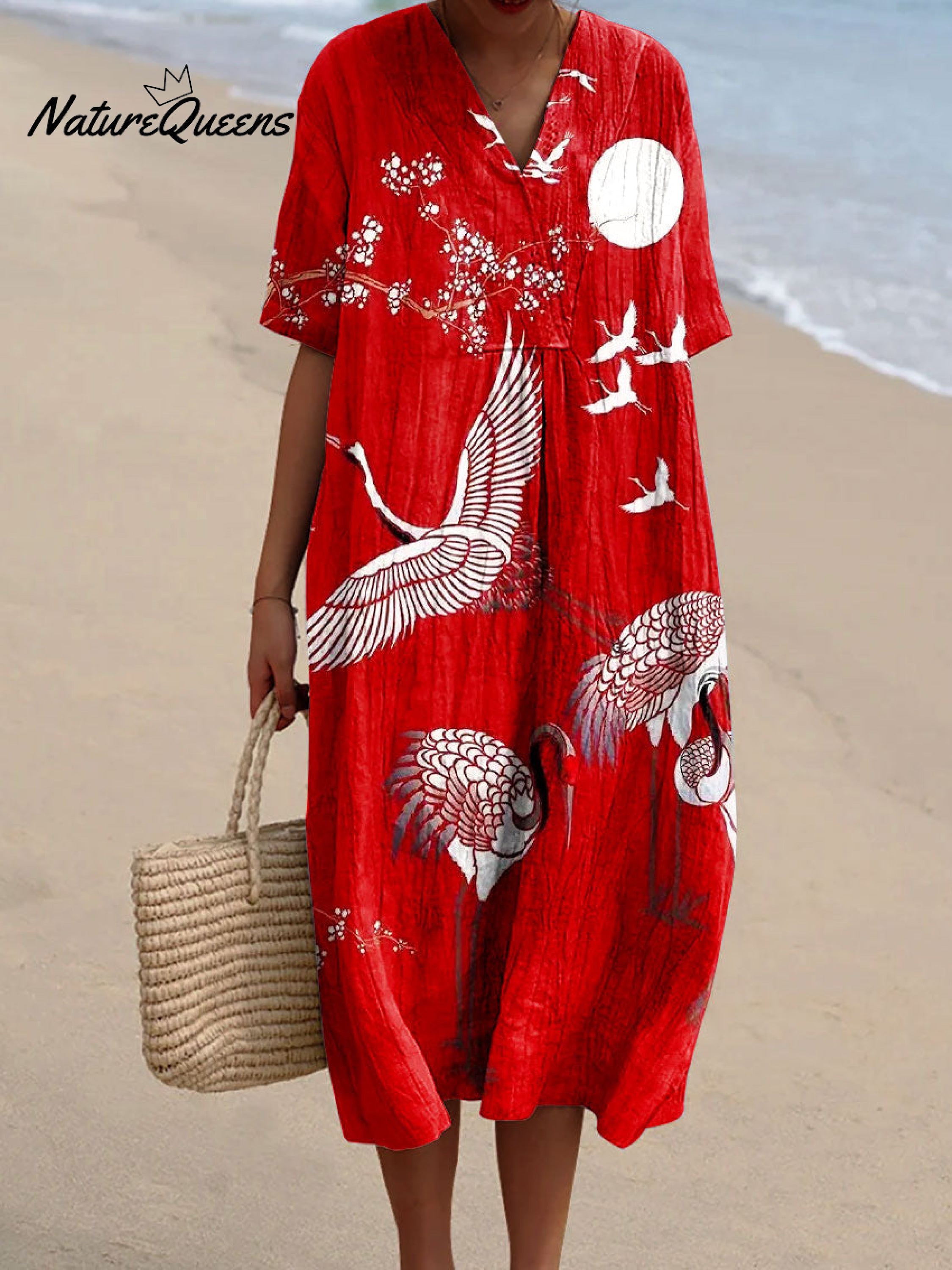 Women's Vintage Red Crane Bird Illustration Art Print Flowy Dress