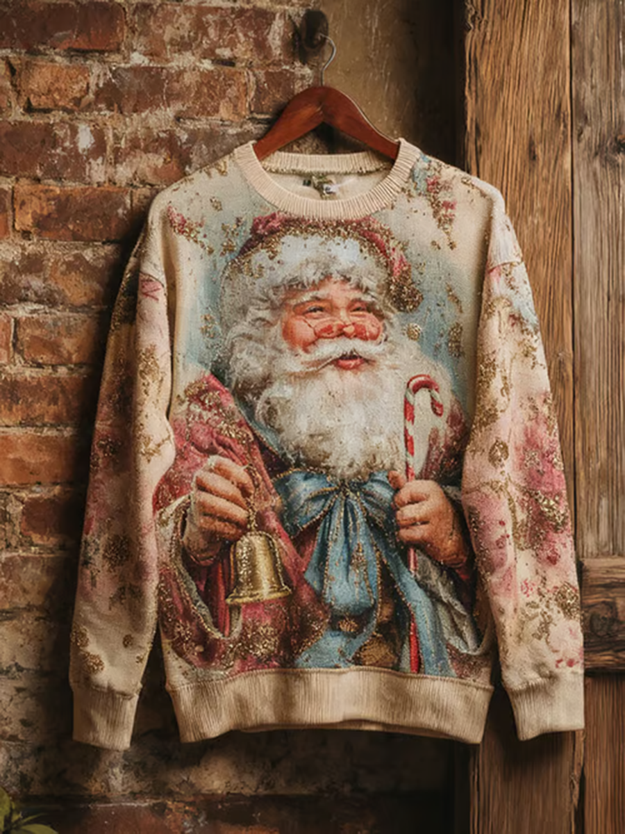 Women's Vintage Santa Print Crew Neck Sweater Top