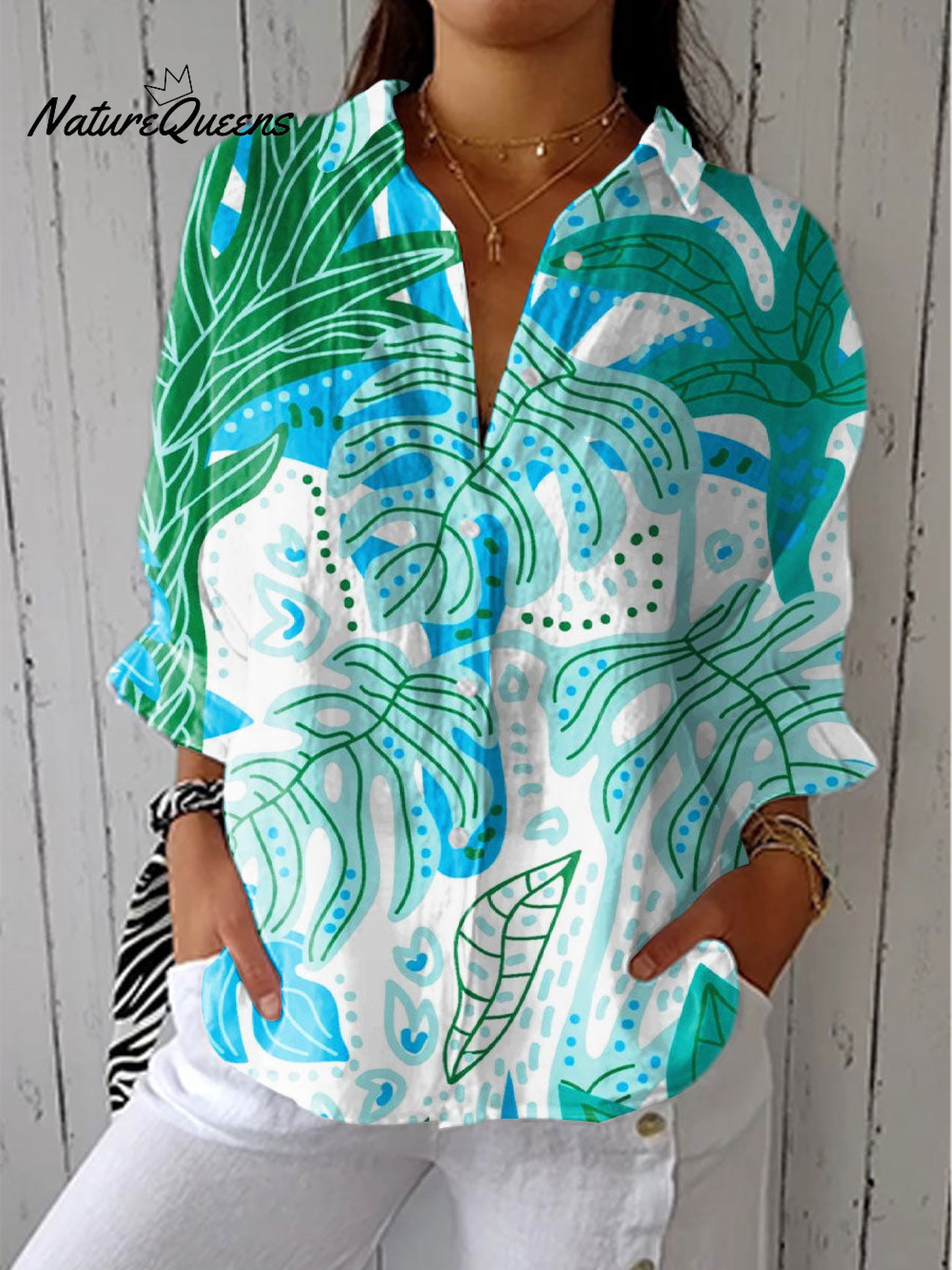 Women's Vintage Tropical Botanical Art Print Casual Linen V-neck Shirt