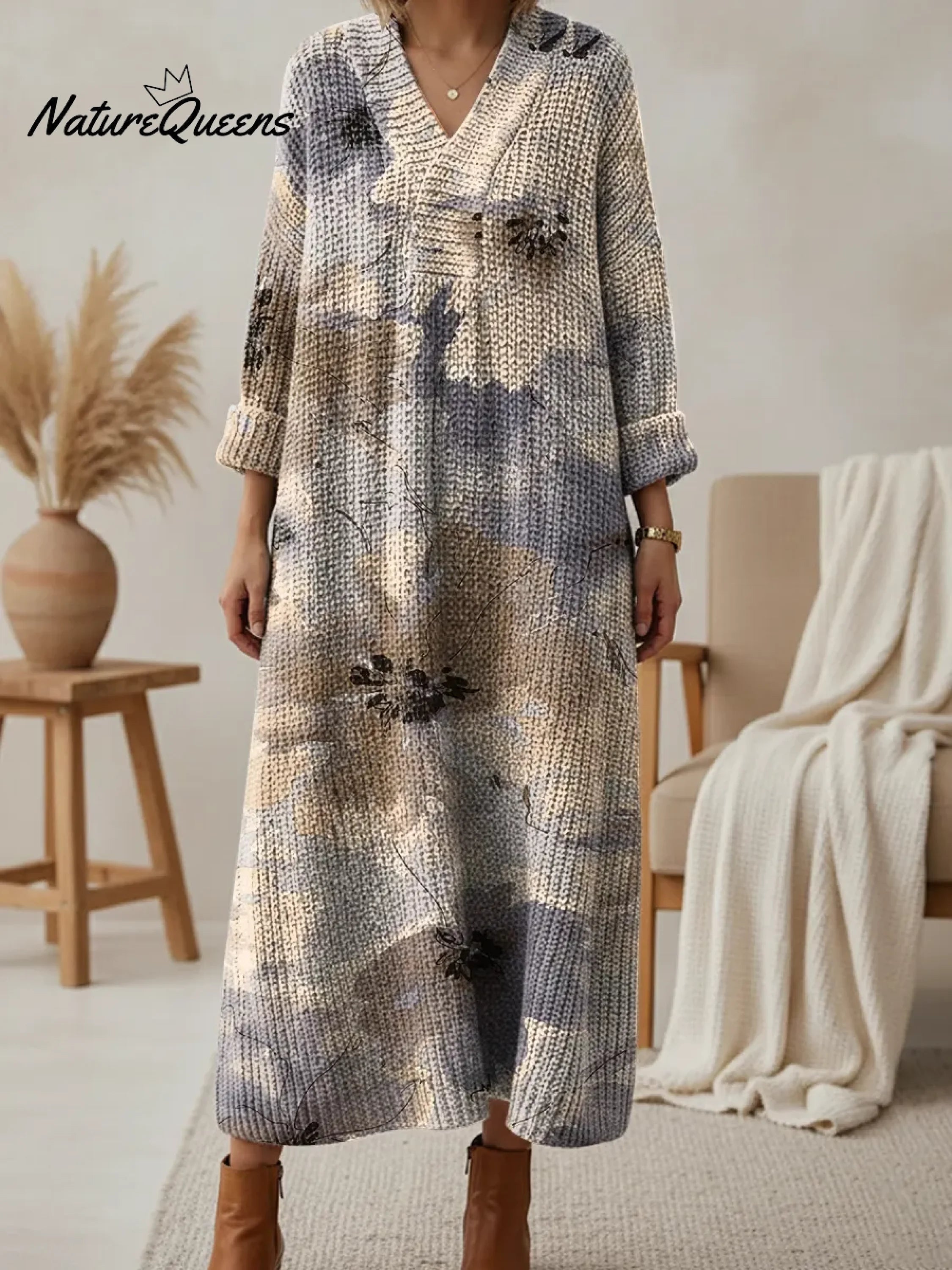 Women's Watercolor Art Flowers V-neck Knit Dress