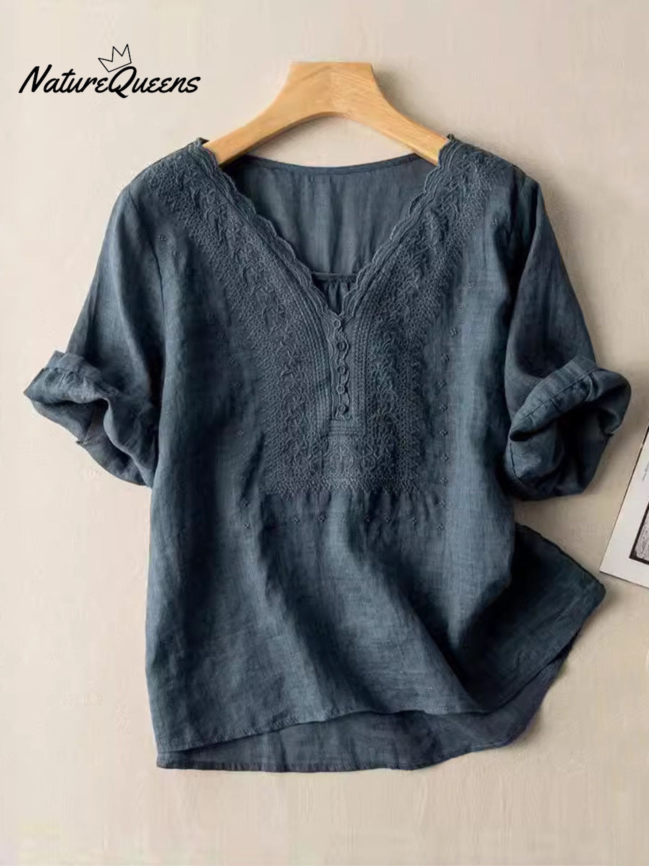 Women's Wave Embroidery V-Neck Solid Color Half Sleeve Cotton and Linen Top